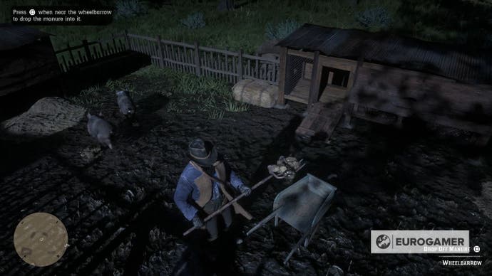 Es schaufelt Kot! Sie müssen die Gabel abholen, in den Schweinestall gehen und drei Hügel Poo aufnehmen, die bequem auf Ihrer Karte markiert sind, und stecken Sie sie in die Schubkarre in der Nähe. Sobald Sie fertig sind, gibt es eine weitere Gesprächskürzung.