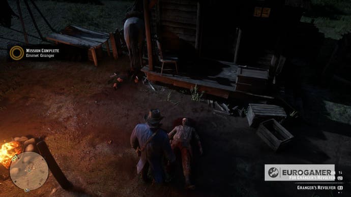 Grant wird dort gebunden sein – töten Sie die Banditen, setzen Sie ihn auf den hinteren Teil des Pferdes und gehen Sie zum neuen Wegpunkt in der Nähe, um ihn an Levin und Calloway zu liefern. Dort wird sich eine Zwischensequenz entfalten.
